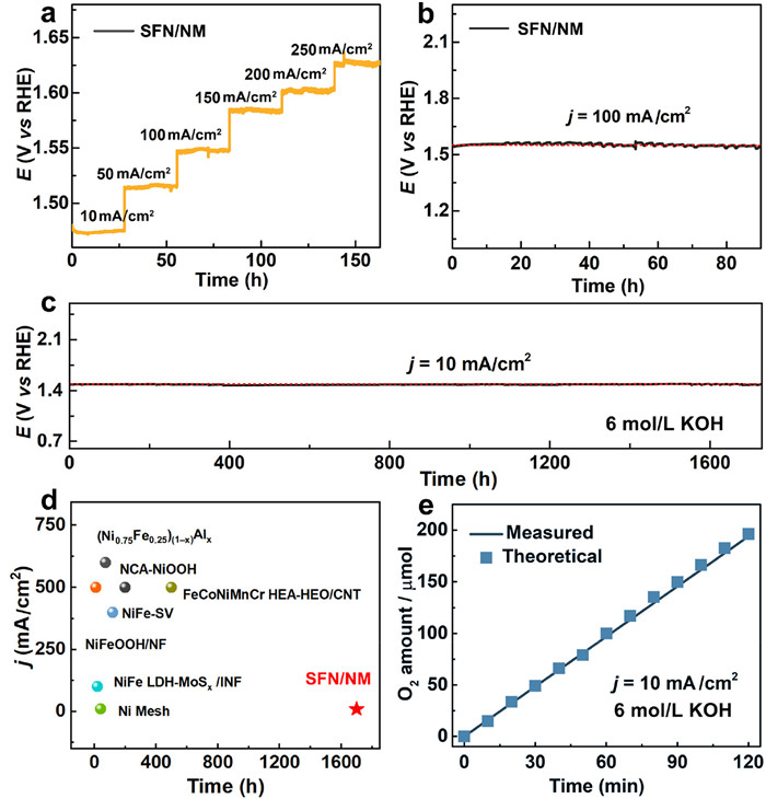 | Fig. 5. Stability and electrochemical performance of SFN/NM electrode for OER in 6 mol/L KOH solution. (a) Multi-step chronoamperometric response performed at sequential current density ranging from 10 mV to 250 mA/cm2 with an increment of 50 mA/cm2 every 27 h. (b) chronopotentiometric stability cure at 100 mA/cm2. (c) Long-term stability at a current density of 10 mA/cm2. (d) Comparison of long-term stability for SFN/NM and reported OER catalysts. (e) Faradaic efficiency at a current density of 10 mA/cm2. | |