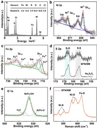 | Fig. 3. (a) SEM-EDS spectrum of SFN/NM. High-resolution XPS spectra of (b) Ni 2p, (c) Fe 2p, (d) S 2p, (e) O 1s for SFN/NM electrode, (f) Raman spectroscopy of SFN/NM electrode. | |