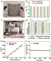 | Fig. 6. (a) Scale-up experiment of the rapid self-functionalization method, numbers 1 to 6 are randomly selected spatial positions on the electrode, where we conducted systematic characterization to verify the uniformity of our rapid self-functionalization method. (b) OER electrocatalytic assessment of six sampling areas (1.6 m × 1.6 m) from the scaled-up SFN/NM, confirming the reproducibility and consistency of the surface-functionalized electrode in a laboratory three-electrode system. (c) Photograph and (d) schematic diagram of the industrial alkaline electrolyzer provided by PERIC Hydrogen Technologies Co., Ltd. (China). (e) OER polarization curves of electrolyzers employing SFN/NM and Raney nickel electrodes in 30% KOH electrolyte at 80 ℃. (f) Long-term voltage-time profile of SFN/NM-based industrial electrolyzer under a constant current density of ~300 mA/cm2. | |