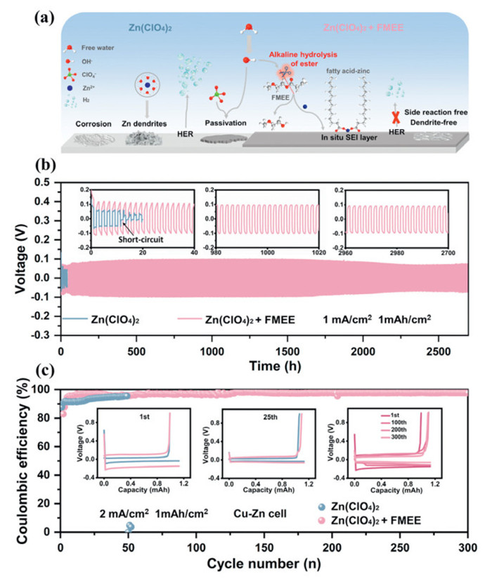 As a matter of fact, the locations on the Zn anode surface where HER occurs are accompanied by local accumulation of by-products, and these active sites are most in need of "passivation". In this strategy, FMEE can capture OH− at the right locations and construct in situ fatty acid-zinc rich SEI, achieving high-quality passivation to ensure the SEI is uniform and dense. Therefore, through the combination of electrochemical decomposition and chemical deposition, we can turn prior disadvantages into advantages.