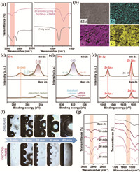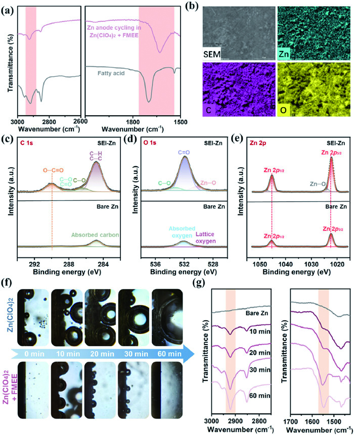 | Fig. 3. In situ formation mechanism of fatty acid-zinc SEI. (a) FTIR spectra of fatty acid powder and Zn anode after cycling in Zn(ClO4)2 + FMEE electrolyte for 50 h (SEI-Zn). (b) EDS mapping images of SEI-Zn. (c-e) XPS spectra of bare Zn and SEI-Zn. (f) Optical microscopy images were captured of Zn anodes during the deposition process at various time intervals in two different electrolytes within quartz electrochemical cells. (g) FTIR spectra of Zn anodes corresponding to different deposition time. | |