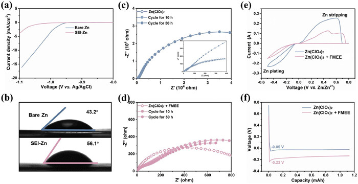 | Fig. 4. The improvement in Zn deposition behaviors. (a) LSV curves of bare Zn and SEI-Zn tested at a scan rate of 5 mV/s. (b) Contact angles of the corresponding electrolytes on bare Zn and SEI-Zn. (c, d) EIS spectra of Zn||Zn symmetric cells with two electrolytes tested immediately after assembly and after cycling for 10 h/50 h. (e) CV curves showing Zn nucleation behavior on Cu cathodes and (f) initial nucleation overpotentials of Zn plating on Cu cathodes in Zn||Cu asymmetric cells in two electrolytes. | |