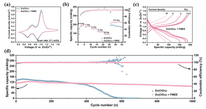 To validate our hypothesis, FMEE was added to aqueous electrolyte containing zinc sulfate (ZnSO4) and Zn(ClO4)2. As shown in Fig. S2 (Supporting information), the Zn(ClO4)2 + FMEE is a clear solution, while the ZnSO4 + FMEE is consistently a turbid solution. Therefore, we chose Zn(ClO4)2-based system as the study subject. The designed electrolytes are denoted as Zn(ClO4)2 + x% FMEE, where x% represents the mass concentration of FMEE in the total electrolyte (wt%).