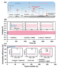 In recent years, the demand for high-efficiency and eco-friendly energy storage technologies has propelled the rapid advancement of rechargeable batteries. Non-aqueous lithium-ion batteries (LIBs) are the predominant rechargeable power sources in the market. However, owing to the limited lithium reserves, high cost, and potential safety hazard of LIBs, the development of alternative electrochemical energy storage technologies has been stimulated [1]. Among these, aqueous zinc ion batteries (ZIBs) have emerged as one of the most promising candidates because of their low cost, non-flammability, and environmental friendliness [2,3]. Zn metal as anode possesses significant advantages such as abundant reserves (100 times that of lithium), high theoretical specific capacity (820 mAh/g and 5855 mAh/cm3), low redox potential (−0.76 V vs. standard hydrogen electrode (SHE)), compatibility with water, and high safety. However, the notorious Zn dendrite growth and side reactions (such as hydrogen evolution reaction (HER), corrosion, and passivation) will cause internal short circuits and low coulombic efficiency (CE) of Zn stripping/ plating [4-10].