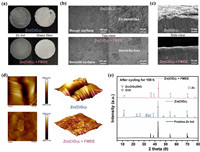 | Fig. 2. Characterizations of the Zn anodes after cycling for 100 h at 1 mA/cm2 and 1 mAh/cm2 in Zn(ClO4)2 and Zn(ClO4)2 + FMEE electrolytes. (a) Digital images of Zn anodes and glass fibers after cycling in two electrolytes. (b) Top-view SEM images and (c) side-view SEM images of Zn anodes after cycling in two electrolytes. (d) AFM images of Zn anodes after cycling in two electrolytes. (e) XRD pattern of Zn anodes after cycling in two electrolytes. | |