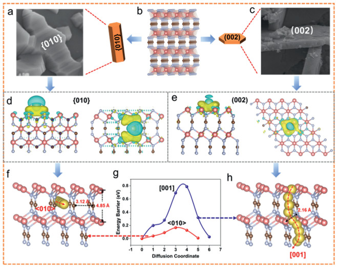 | Fig. 4. Theoretical simulations of Na storage and diffusion in FeNCN crystal structure; (a, c) FeNCN with different exposed facets. (b) Crystal structure of FeNCN. (d, e) Differential charge density map for {010} and (002) facets (yellow for electron accumulation and blue for electron depletion, respectively). (f, h) Typical models of Na atom diffusion paths along [010] and [001] direction. (g) Na diffusion energy profiles through the different paths. | |