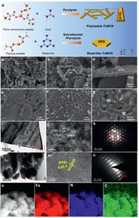 | Fig. 1. (a) Schematic illustration of preparation route for P-FeNCN and S-FeNCN. SEM images of (b-d) S-FeNCN and (e-h) P-FeNCN. Transmission electron microscopy (TEM) and high-resolution TEM (HRTEM), the selected area electron diffraction (SAED) images for (i-k) S-FeNCN and (l-n) P-FeNCN. (o) STEM image of P-FeNCN with the corresponding Fe, N and C elemental mapping images. | |
