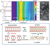 | Fig. 2. (a) Time-resolved operando XRD patterns. HRTEM of the P-FeNCN electrode: (b) After fully discharged at 0.01 V and (c) fully recharged at 3.0 V. (d) Schematic diagram of sodium ion storage in FeNCN. | |