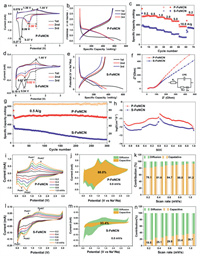 where k1v and k2v1/2 represent pseudocapacitance and diffusion controlled process, respectively [6]. Accordingly, the pseudocapacitance percentage for P-FeNCN and S-FeNCN was calculated to be 88.0% and 33.4% at 0.8 mV/s, respectively (Figs. 3j and m). Notably, the pseudocapacitance contributes 78.1% of total capacity for P-FeNCN even at ultralow scan rate of 0.2 mV/s (Fig. 3k), than 18.5% of S-FeNCN (Figs. 3k and n) revealing that the pseudocapacitive storage of P-FeNCN arises from a synergistic combination of surface and intercalation capacitance [42,43].
