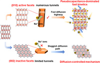 Current strategies to enhance the fast-charging capability of sodium-ion batteries primarily involve two key approaches: (1) Incorporating highly conductive materials to optimize electron transport efficiency; (2) Reducing the size to increase the proportion of sodium ion stored sites on the surface area, which is called surface-dominated storage process (surface-pseudocapacitance [20,21]). However, the increased surface area will cause a low initial coulombic efficiency [6]. Bruce Dunn and his co-workers put forward intercalation-pseudocapacitance, which occurs in the entire bulk material with facile ion diffusion channels [20,22-25]. Therefore, significant enhancement in capacitive storage can be achieved by increasing the number of fast ion diffusion channels [24,26,27]. As is established, due to the anisotropy of the crystal, different exposed crystal facets have diverse adsorption stability of sodium ions and various diffusion energy barriers, which are crucial for sodium storage performance [28-32]. Active facets with stable adsorption ability and abundant broad channels to diffusion will significantly improve the intercalation pseudocapacitive sodium ion storage [33-35]. Therefore, it is critical to control the crystal orientation toward large exposure of active facets to improve the sodium ion diffusion rate [28,35,36].