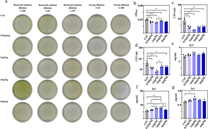 | Fig. 2. MIC boosts humoral immunity to eliminate bacteria. (a) Representative images of bacterial culture of bacterial solution mixed with Sprague-Dawley rats' serum after different treatments. (b) Measure the OD600 of a mixed solution with a colony count greater than 300. OD600 of bacterial solution (dilution 1:100) equal volume mixed with serum. (c) Bacteria counts of LB agar medium after bacterial solution (dilution 1:106) equal volume mixed with serum. (d) Bacteria counts of LB agar medium after bacterial solution (dilution 1:106) equal volume mixed with serum (dilution 1:10). The levels of (e) IgM, (f) IgG, and (g) IgA in the serum of Sprague-Dawley rats after different administrations. n = 3. Data are presented as mean ± SD, *P < 0.05, **P < 0.01, ***P < 0.001. | |
