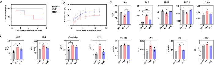 | Fig. 3. (a) Survival curves. Sepsis models were established using CLP. Survival was monitored until 7 days after the second administration (n = 7). (b) The anal temperature. Anal temperature change curves of mice after the second administration (n = 3). (c) The levels of IL-4, IL-6, IL-10, TGF-β1, and TNF-α in the serum were measured 24 h after the second administration (n = 3). (d) The levels of AST, ALT, creatinine, blood urea nitrogen (BUN), creatine kinase-MB (CK-MB), lactate dehydrogenase (LDH), nitric oxide (NO), and C-reactive protein (CRP) in the serum were measured 24 h after the second administration (n = 3). Data are presented as mean ± SD, *P < 0.05, **P < 0.01, ***P < 0.001, ****P < 0.0001. | |