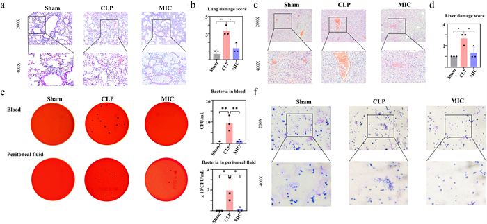 | Fig. 4. MIC reduces organ damage and bacterial burden in CLP mice. (a) The results of the H&E staining of lung tissues from mice after the second administration for 24 h (the magnification is 400 ×, and the scale bar is 25 μm). (b) Lung damage score of H&E staining. (c) The results of the H&E staining of liver tissues from mice after the second administration for 24 h (the magnification is 400 ×, and the scale bar is 25 μm). (d) Liver damage score of H&E staining. (e) 24 h after the second administration, the mice were euthanized to obtain blood and peritoneal fluid (peritoneal fluid: approximately 2.5 mL of sterile cold physiological saline was injected into one side of the mice's abdominal cavity, and then the fluid was sucked back from the other side of the mice's abdominal cavity, which is called peritoneal fluid). Take 100 μL of blood and peritoneal fluid from each mouse separately and apply them to blood agar plates for bacterial culture. Representative images of bacteria counts in blood agar plates. (f) Representative images of Wright's stain of peritoneal fluid 24 h after the second administration (the magnification is 400 ×, and the scale bar is 25 μm) (n = 3). Data are presented as mean ± SD, *P < 0.05, **P < 0.01. | |