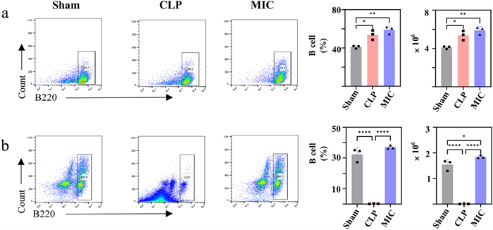 | Fig. 5. MIC treatment positively influences B cells in the spleens and mLNs of septic mice. The spleens and mLNs were harvested 24 h after the second administration. Flow cytometric quantification of B220+ B cell in (a) spleens and (b) mLNs (n = 3). Data are presented as mean ± SD, *P < 0.05, **P < 0.01, ***P < 0.001, ****P < 0.0001. | |