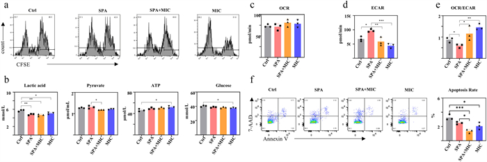 | Fig. 6. MIC promotes proliferation, affects metabolism, and inhibits apoptosis in B cells. Ramos was stimulated using SPA, SPA mixed with MIC, MIC, and non-treated (PBS) for 48 h, respectively. (a) Cell proliferation using CFSE labeling by flow cytometry. (b) The levels of lactic acid, pyruvate, extracellular relative ATP, and glucose in cell supernatant. (c) The OCR was measured by an oxygen-sensitive probe for 150 min. (d) The ECAR was measured by incubation at 37 ℃ for 150 min. (e) A quantitative graph of the ratio of OCR to ECAR. (f) Apoptosis rate by flow cytometry using 7-AAD and Annexin V (n = 3). Data are presented as mean ± SD, *P < 0.05, **P < 0.01, ***P < 0.001. | |