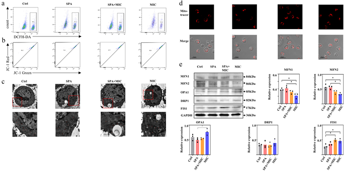 | Fig. 7. MIC alleviates mitochondrial dysfunction in B cells. Ramos was stimulated using SPA, SPA mixed with MIC, MIC, and non-treated (PBS) for 48 h, respectively. (a) ROS was detected by flow cytometry using DCFH-DA. (b) MMP was detected by flow cytometry using JC-1. (c) Sub-cellular morphology was observed by TEM. Scale bars, 2 µm (up) and 1 µm (down). (d) Cells were incubated for 20 min at 37 ℃ with 25 nmol/L Deep Red-Fluorescent Mitotracker. Mitochondria (red spot) were observed by a laser confocal microscope (Scale bar, 10 µm). (e) The expression levels of MFN1, MFN2, OPA1, DRP1, and FIS1 were measured using WB analysis. Relative intensities were quantitated by densitometry using ImageJ and normalized to GAPDH levels. n = 3. Data are presented as mean ± SD, *P < 0.05, **P < 0.01, ***P < 0.001. | |