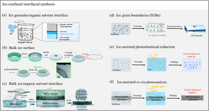 Although hundreds of materials have been synthesized with the assistance of ice chemistry, there is an absence of generalization about the underlying synthesis principles. Here, three critical strategies of ice-assisted synthesis are classified as follows: (1) Ice-confined interfacial synthesis, (2) ice-templating physical synthesis, and (3) ice-melting chemical synthesis.