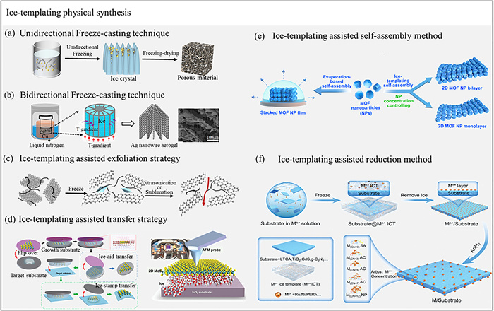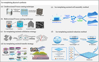 | Fig. 3. (a) Unidirectional freeze-casting technique. (b) Bidirectional freeze-casting technique. Copied with permission [47]. Copyright 2019, American Chemical Society. (c) Ice-templating assisted exfoliation strategy. Reproduced with permission [50]. Copyright 2020, Wiley Publishing Group. (d) Schematic illustration of ice-aid transfer and ice-stamp process. Copied with permission [51]. Copyright 2023, Wiley Publishing Group. (e) Schematic of constructing 2D MOF nanoparticle monolayer via ice-templating-assisted self-assembly method. Copied with permission [53]. Copyright 2023, American Chemical Society. (f) Schematic illustration of ice-templating-assisted H2-reduction method for producing diverse metallic co-catalysts. Copied with permission [20]. Copyright 2024, Wiley Publishing Group. | |