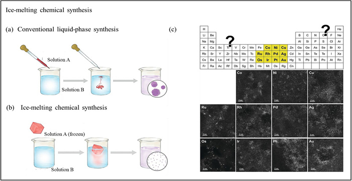 | Fig. 4. (a) Schematic of the conventional liquid-phase synthesis method. (b) Schematic of ice-melted synthesis method for atomically dispersed metals. (c) Periodic table of the elements and STEM images for atomically dispersed metals using the ice-melted method. (a-c) Reproduced with permission [59]. Copyright 2018, Wiley Publishing Group. | |