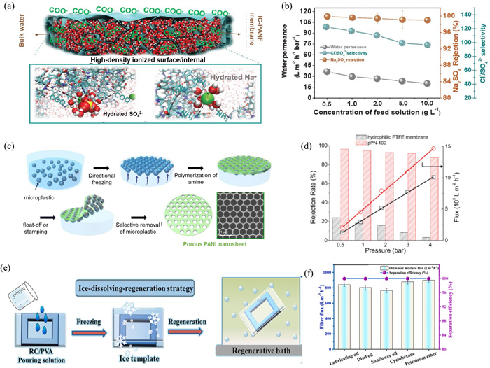 | Fig. 5. (a) Schematic of the high-density ionized internal behavior of IC-PANF. (b) The water performance, co-ion Cl-/SO42- selectivity, and NaSO4 rejection of IC-PANF membrane. (a, b) Copied with permission [25]. Copyright 2023, American Association for the Advanced of Science. (c) Schematic of the ice-assisted synthesis of porous 2D PANI nanosheets. (d) Rejection rate of the PTFE membrane and pPN membrane for SARS-Cov-2. (c, d) Copied with permission [73]. Copyright 2022, the Royal Society of Chemistry. (e) Schematic illustration of the fabrication of RC@PVA membranes. (f) The performance of RC@PVA membrane. (e, f) Copied with permission [74]. Copyright 2024, Elsevier. | |