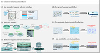 | Fig. 2. (a) Freezing-improved sol-gel methods for the synthesis of 2D metal oxides. Reproduced with permission [28]. Copyright 2013, the Royal Society of Chemistry. (b) The synthesis procedures of 2D PANI on bulk ice surfaces. Reproduced with permission [38]. Copyright 2015, Wiley Publishing Group. (c) Schematic of the IC-PANF membrane at the ice/n-hexane interface. Copied with permission [25]. Copyright 2023, American Association for the Advanced of Science. (d) 2D materials synthesis within ice grain boundaries (IGBs). Reproduced with permission [43]. Copyright 2023, Wiley Publishing Group. (e) Schematic diagram of ice-assisted photochemical reduction method. Reproduced with permission [44]. Copyright 2017, Springer Nature. (f) Schematic diagram of ice-assisted photocatalytic synthesis method. Reproduced with permission [19]. Copyright 2019, Elsevier. | |