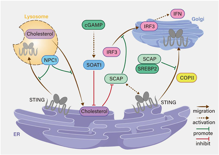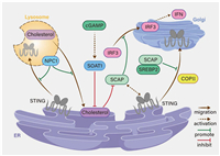 | Fig. 2. Interaction between cholesterol metabolism and the STING pathway. Cholesterol is transported from the lysosome by NPC1, influencing STING activation in the ER. STING then translocates to the Golgi, where it activates IRF3, leading to IFN production. Cholesterol regulates this process through molecules like SOAT1 and SCAP-SREBP2, which can either promote or inhibit STING activation and signaling. The diagram highlights cholesterol's role in regulating both metabolism and immune responses. | |