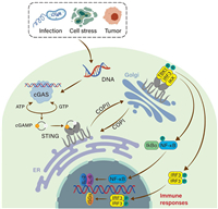 | Fig. 1. The diagram shows the process of the cGAS-STING pathway. When DNA from infections, cell stress, or tumors enters the cytoplasm, it activates the enzyme cGAS. cGAS then produces cGAMP, which binds to STING protein in the ER. STING moves to the Golgi and triggers other proteins, like TBK1 and IRF3, to activate. These proteins then enter the nucleus, turning on genes that lead to an immune response, producing molecules like interleukin 2 (IL-2) and IL-6 to fight off infections or tumors. IKK, inhibitor of kappaB kinase; cGAMP, cyclic GMP-AMP; GTP, guanosine triphosphate; ATP, adenosine triphosphate; IκBα, inhibitory subunit of NF kappa B alpha; NF-κB, nuclear factor kappa-B; ISGs, interferon-stimulated genes. | |