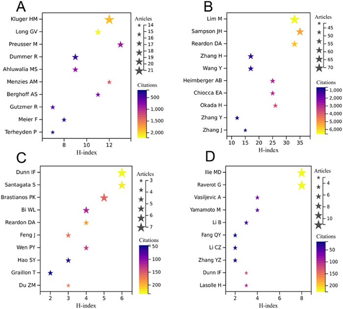Long was the most cited author (2216 citations) in the field of immunotherapy for brain metastasis, followed by Kluger (1927 citations) and Menzies (1346 citations). For glioma immunotherapy, three authors had been cited over 5000 times, with Lim being the most cited author (6583 citations), followed by Reardon (5805 citations) and Sampson (5338 citations). Dunn had the highest number of citations (234 citations) for meningioma immunotherapy, followed by Santagata (229 citations). The field of immunotherapy for pituitary adenoma was still in its infancy, and only three authors (Ilie, 226 citations; Raverot, 226 citations; Dunn, 126 citations) had been cited more than 100 times so far (Table S4). For the H-index score, the gaps between the top 10 productive authors in each area were insignificant. However, as widespread attention to glioma immunotherapy grew, the H-index scores of researchers were much higher than those of the researchers in the other three areas (Fig. 2). The network analysis of the co-researchers also revealed a worrying lack of collaboration at a global level, particularly in the immunotherapy of meningiomas and pituitary adenomas (Fig. S3 in Supporting information).