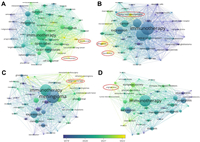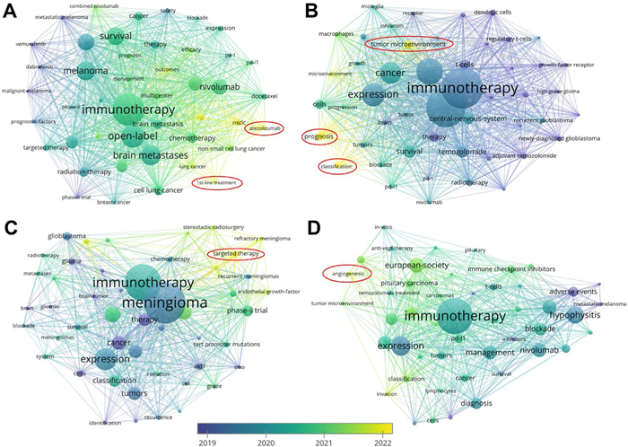 | Fig. 3. The keyword co-occurrence networks for publications on immunotherapy including (A) brain metastasis, (B) glioma, (C) meningioma, and (D) pituitary adenoma. Lines connecting nodes indicate the co-occurrence of keywords, with each node representing an individual keyword. Node size reflects the frequency of occurrences. | |