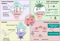 5.1. ImmunotherapyThe major immunotherapies currently under study encompass ICIs, CAR-T therapy, tumor vaccines, and oncolytic virus (OV) therapy (Fig. 4) [2,55–58]. ICIs function by obstructing the binding of checkpoint proteins to their partner proteins, thus empowering T cells to initiate tumor cell death. Notable targets for checkpoint proteins include PD-1 (nivolumab, pembrolizumab), PD-L1 (durvalumab, atezolizumab), and cytotoxic T-lymphocyte associated protein 4 (CTLA-4; ipilimumab) [59–61]. CAR-T therapy employs CAR technology, where synthetic receptors are affixed to T cells. By binding to the major histocompatibility complex, CAR-T cells gain the ability to identify and eliminate tumor cells [62–65]. Tumor vaccines exploit tumor-associated antigens that are either present at low levels or absent in healthy cells [57,66]. These vaccines prime the immune system to recognize and respond to these specific antigens, facilitating the targeting and eradication of cancer cells [67–69]. Oncolytic viral therapy involves the injection of viruses into tumors, and these viruses infect both neighboring normal tissue and cancer cells. While normal cells efficiently clear the virus, cancer cells are incapable of doing so. As a result, the virus proliferates uncontrollably within the cancer cells, ultimately leading to their demise [70–72].