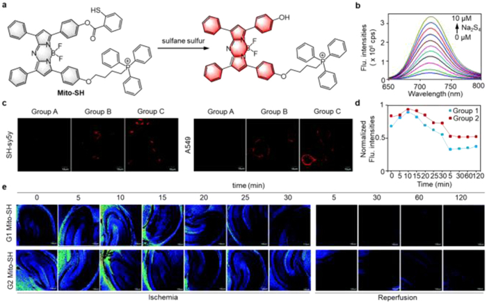 | Fig. 10. (a) Sulfane sulfur sensing mechanism of Mito-SH. (b) FL spectra. (c) Confocal fluorescence images of cell models. Group A (cultured with DMEM/RPMI 1640/MEM containing 25 mmol/L glucose for 3 h). Group B (cultured with glucose-free DMEM under 0.1% O2 for 3 h). Group C (pretreated with 2DG for 3 h and then cultured under 0.1% O2). (d) Normalized FL intensities of IR mice. (e) The analysis of hippocampal slices in the IR mice models. Reproduced with permission [74]. Copyright 2018, The Royal Society of Chemistry. | |
