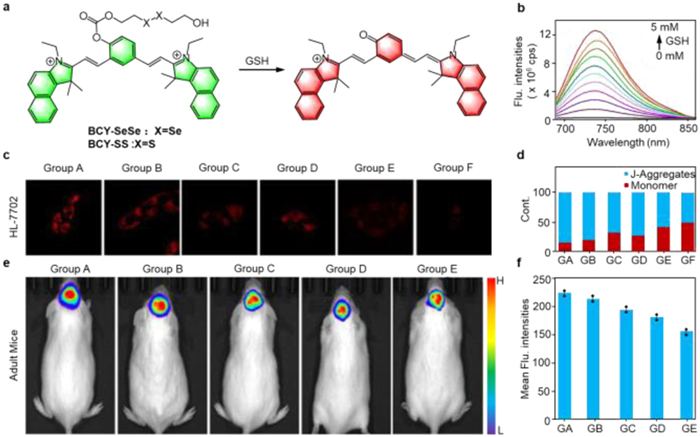 | Fig. 11. (a) GSH sensing mechanism of BCY-SeSe and BCY-SS. (b) FL spectra. (c) Confocal fluorescence imaging in cell models. (d) The histograms show FCA for ΔΨm of different cell lines by JC-1. (e) Imaging in IRI mice models. (f) FL intensities of adult mice. Reproduced with permission [79]. Copyright 2019, American Chemical Society. | |