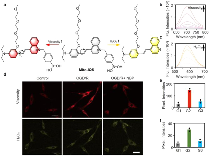 Later, a novel dual mitochondria-targeting fluorescent probe following a molecular rotor strategy, Mito-IQS (Fig. 14), for separate visualization of the viscosity and H2O2 is investigated. The quinoline cation possesses the capacity to both locate mitochondria and exhibit lipophilicity. Additionally, trimethylene glycol monomethyl ether, which has excellent amphiphilicity, further enhances the lipophilicity of the probe, as sufficient lipophilicity is an essential theoretical basis for the passive diffusion of molecules through the BBB. By incorporating distinct recognition groups upon mitochondrial viscosity and H2O2, a discerning reaction can be detected through various color channels (viscosity: red channel, λem = 670 nm; H2O2: yellow channel, λem = 570 nm) during CIRI-treated SH-SY5Y cells and mouse models [87].