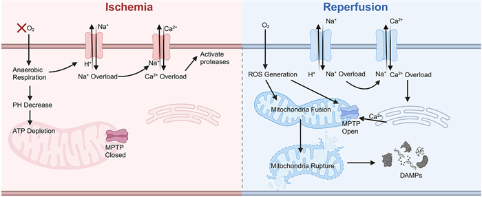Ischemia-reperfusion occurs when blood flow to organs is initially obstructed and subsequently restored. This phenomenon, often resulting from arterial occlusion from by an embolus, creates an imbalance between energy supply and demand, leading to tissue hypoxia and damage [1]. Unfortunately, the restoration of blood flow and oxygenation can exacerbate tissue damage, triggering a significant inflammatory response known as "reperfusion injury" [2]. Ischemia-reperfusion injury (IRI) contributes to various pathological conditions, including abnormal levels of reactive oxygen species (ROS) and intracellular calcium ions, inflammatory responses, energy metabolism disorders, and mitochondrial dysfunction [3]. Consequently, it can lead to challenging-to-treat diseases such as acute myocardial infarction (AMI) [4], acute kidney injury (AKI) [5], cerebral vascular accident (CVA) [6], and hepatic insufficiency (HI) [7], all of which pose significant risks to human health and life.