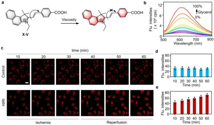| Fig. 4. (a) Viscosity sensing mechanism of X-V. (b) FL spectra. (c) Real-time fluorescence imaging in IRI cell models. (d) Mean FL intensities of the control group. (e) Mean FL intensities of the HIRI group. Reproduced with permission [50]. Copyright 2023, Royal Society of Chemistry. | |