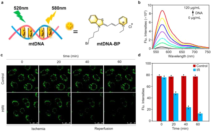 The design idea for mtDNA detection is to fabricate suitable probe dimensions with mitochondrial targeting groups, which can accumulate in mitochondria and be inserted into the DNA groove. Due to DNA's spatial limitations, the intramolecular rotation is restricted, decreasing the nonradiative transfer of the excited state and consequently causing illumination. Following the approach above, mtDNA-BP (Fig. 5) is synthesized and demonstrates a strong fluorescence intensity at 580 nm upon DNA addition. Subsequently, as the IR injury in cell models advanced, fluorescence gradually decreased, indicating that the gradual deterioration of IR worsened the harm to mtDNA, ultimately leading to its destruction [55].