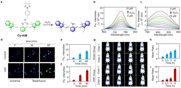| Fig. 7. (a) H2O2 sensing mechanism of Cy-ArB. (b) FL spectra. (c) Fl spectra towards H2O2. (d) Real-time fluorescence imaging in IRI cell models. (e) FL intensities in the control group. (f) FL intensities in the HIRI group. (g) In vivo imaging of endogenous H2O2. (h, i) Mean ratios of (g). Reproduced with permission [60]. Copyright 2019, Royal Society of Chemistry. | |