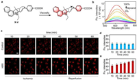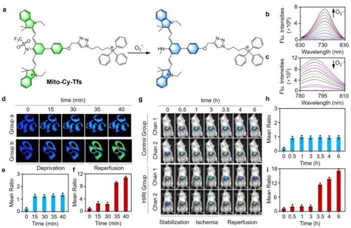| Fig. 8. (a) O2•− sensing mechanism of Mito-Cy-Tfs. (b) FL spectra. (c) FL spectra. (d) Ratio images of cell models (d). (e) FL intensities of groups a and b. (g) In vivo imaging of mice. (h, i) FL intensities of the control group and HIRI group. Reproduced with permission [63]. Copyright 2017, Elsevier. | |