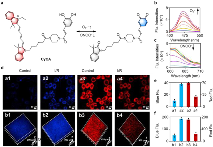 | Fig. 9. (a) O2•− and ONOO− sensing mechanism of CyCA. (b) One-photon FL spectra of O2•−. (c) One-photon FL spectra of ONOO−. (d) In vivo 3D images of normal and IR mice liver for blue and red fluorescence imaging. (e) FL intensities of (a). (f) FL intensities of (b). Reproduced with permission [68]. Copyright 2019, Elsevier. | |