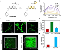 | Fig. 12. (a) MDA sensing mechanism of Lyso-MCBH. (b) FL spectra. (c) Two-photon fluorescence imaging cell models. (d) FL intensities in (c). (e) Two-photon 3D fluorescence imaging in mice models. (f) FL intensities in (e). Reproduced with permission [84]. Copyright 2023, American Chemical Society. | |