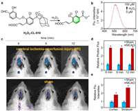 | Fig. 13. (a) H2O2 sensing mechanism of H2O2—CL-510. (b) FL spectra. (c) In vivo chemiluminescent imaging in mice models. (d) Quantifications of photon fluxes released in mice models. (e) Quantifications of FL intensities. Reproduced with permission [85]. Copyright 2020, Wiley-VCH. | |