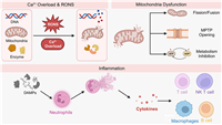 Various pathological mechanisms that cause cell death can be activated by cytosolic Ca2+ overload. With the recovery of blood flow upon reperfusion, SERCA consumes more ATP due to its neighboring spatial position, which accelerates the cytoplasm-SR calcium cycle into a high-load state, resulting in calcium oscillations and ultimately affecting the entire cell. Furthermore, the activation of calpains due to Ca2+ overload not only hydrolyzes cytoskeletal proteins and ankyrin, causing the breakdown of cell structure but also degrades signal proteins such as protein kinase C (PKC) and Ca2+/calmodulin-dependent protein kinases (CaMKs), disrupting normal cell activities. Furthermore, as an inhibitor of calpains by reversibly binding, endogenous calpastatin is degraded in IRI, resulting in continuous damage to cells from Ca2+ overload, thereby contributing to cell death. Additionally, elevated intracellular Ca2+ levels produce complexes that attach to intracellular proteins, which facilitate the generation of cytokines, such as interleukin-1 beta and tumor necrosis factor-α. These cytokines transmit inflammatory signals to immune cells, stimulating the production of additional cytokines and chemokines, which exacerbates IRI [32,33].