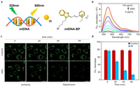 | Fig. 5. (a) mt-DNA sensing mechanism of mtDNA-BP. (b) FL spectra. (c) Real-time fluorescence imaging in IRI cell models. (d) FL intensities of (c). Reproduced with permission [55]. Copyright 2021, American Chemical Society. | |