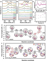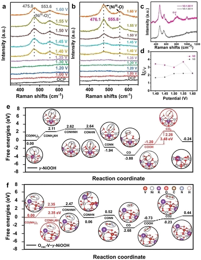 | Fig. 10. In situ Raman spectra of (a) V0 and (b) V2 from circuit potential (OCP) to 1.6 V (vs. RHE). (c) The representative Raman spectra of V0 and V2 at 1.60 V (vs. RHE). (d) The peak intensity ratio of δ(Ni-O) to ν(Ni-O) of V0 and V2. The ΔG profiles of the proposed UOR pathway at (e) γ-NiOOH and (f) Ovac-V-γ-NiOOH. Reproduced with permission [118]. Copyright 2022, Wiley Publishing Group. | |