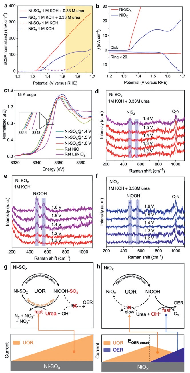 While the generated NiOOH is the highly active species for the OER as well, which is an undesirable side reaction for UOR. Moreover, OER can lead to the over-oxidation of NiOOH to high-valent nickel states, thus reducing electrode stability and consequently decreasing UOR performance. The competition between the two is particularly evident in actual UOR-relevant applications, peculiarly in devices operating at high working voltages and large current densities. This calls for the modification of Ni-based catalysts to repel the OH- and favor the UOR process in alkaline medium. Inspired by this, Qiao and coworkers fabricated an optimized sulfur-oxygen anionic engineered nickel powder catalyst (Ni-SOX) with high UOR performance (Figs. 11a and b) [119]. In comparison with the conventional nickel-based UOR catalyst (NiOx), which is prone to the undesirable e OER side reaction, Ni-SOx exhibited markedly enhanced UOR activity, stability, and nitrogen product selectivity. A series of in situ XAS (Fig. 11c) and in situ Raman spectroscopic (Figs. 11d-f) and theoretical calculations were employed to track and reveal the critical role of anionic oxygen doping in successfully suppressing OER and promoting UOR. The comprehensive mechanism was elucidated, including the competing adsorption behavior of OH- and urea molecules on the catalyst surface for UOR/OER, as well as the dynamic evolution of the Ni active sites in UOR (Figs. 11g and h). According to this advanced research, it is concluded that the reconstruction of Ni-based catalyst into highly active NiOOH species could function as the active center for UOR, while the overoxidation and competitive OER should be suppressed via the modification of Ni-based catalysts.