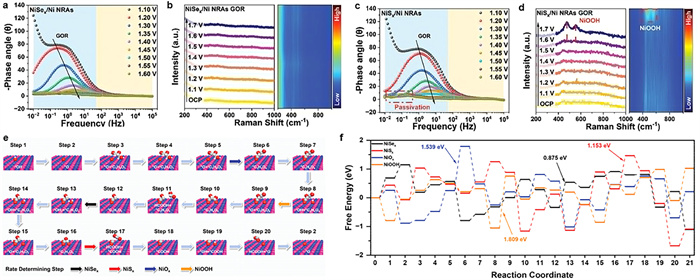 | Fig. 12. Bode plots of in situ EIS of (a) NiSex/Ni and (b) NiSex/Ni during GOR. In situ Raman spectra of (c) NiSex/Ni and (d) NiSx/Ni for GOR. (e) Schematic illustration of the GOR pathway. (f) The ΔG profiles of GOR on NiSex, NiSx, NiOx, and NiOOH. Reproduced with permission [125]. Copyright 2024, Wiley Publishing Group. | |