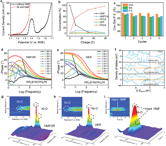 | Fig. 13. (a) LSV curves of NiSx/β-Ni(OH)2/Ni in 1 mol/L KOH + 50 mmol/L HMF solution (red line) and 1 mol/L KOH solution (black line). (b) Conversion and concentration variations of HMF and its oxidation products in HMFOR. (c) The HMFOR of NiSx/β-Ni(OH)2/Ni over 5 continuous cycles. (d) Bode plots of NiSx/β-Ni(OH)2/Ni for HMFOR and (e) OER (1 mol/L KOH). (f) Density of states on NiSx/β-Ni(OH)2/Ni systems. (g-i) In situ Raman spectra of NiSx/β-Ni(OH)2/Ni. Reproduced with permission [130]. Copyright 2023, Wiley Publishing Group. | |
