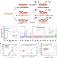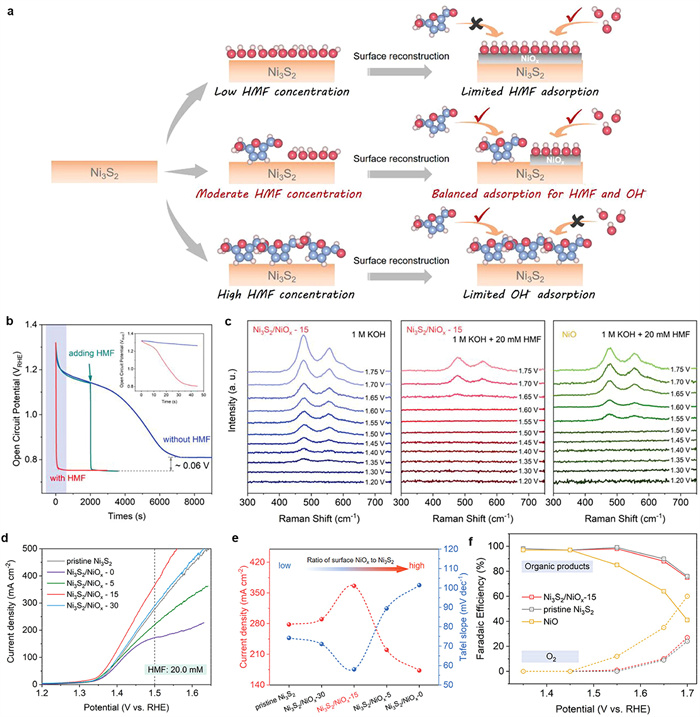More recently, Huang and coworkers also systematically investigated the influence of surface reconstruction of Ni-based catalysts on the electrocatalytic performance of HMFOR [131]. They have constructed a series of Ni3S2/NiOx-n catalysts. By controlling the extent of Ni3S2 surface reconstruction, the ratio of Ni3S2 and NiOx in the Ni3S2/NiOx-n catalyst can be effectively tuned (Fig. 14a), thereby equilibrating the rival adsorption of HMF and OH-. Profiting by the optimal adsorption of these two reactants, the Ni3S2/NiOx-15 catalyst exhibited excellent HMFOR performance (366 mA/cm2 at 1.5 V) and a FE of 98% for FDCA (Figs. 14b and c). Additionally, it is also uncovered that the adsorption of SO42− on the Ni3S2/NiOx surface facilitates the oxidation of NiO to NiOOH and the adsorption of intermediates in HMFOR, promoting the continued enhancement of catalytic performance (Figs. 14d–f).
