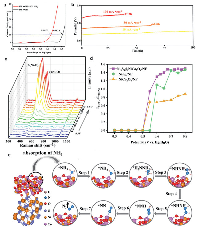 | Fig. 15. (a) LSV curves of different catalysts for AOR. (b) Stability test of the heterostructured catalyst. (c) In situ Raman spectra of Ni3S4@NiCo2O4/NF. (d) δ(Ni-O)-to-ν(Ni-O) ratios in situ Raman spectra. (e) Optimized model of Ni3S4@NiCo2O4 and the schematic illustration of ammonia oxidation process. Reproduced with permission [140]. Copyright 2024, Elsevier. | |