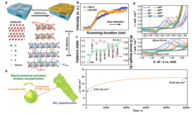 3. Reconstruction strategies for Ni-based electrocatalysts 3.1. Electrochemical activationElectrochemical activation for surface reconstruction refers to a technique used to modify the surface properties of catalysts through electrochemical means [54]. This process can be utilized to enhance various surface properties, such as wettability, corrosion resistance, catalytic activity, or to induce structural changes on the catalyst's surface [55,56]. The general principle behind electrochemical activation for surface reconstruction involves applying an electrical potential or current to the material in an electrolyte solution [57–59]. This electrochemical treatment can trigger various surface modifications, such as the formation or removal of specific surface species, such as oxides, hydroxides, or other compounds and the formation of new crystal phases, grain boundaries [60,61]. The specific electrochemical parameters, such as the applied potential, current density, electrolyte composition, and duration of the treatment, can be carefully controlled to achieve the desired surface modifications [62,63]. The resulting surface properties possess a significant impact on the electrocatalytic performance of catalysts. For example, Xu et al. has designed an electrochemical delithiation LiNiO2 catalyst that takes the full advantage of NiOO*, thereby exhibiting significant OER activity in the absence of Fe [64]. With the electrochemical delithiation proceeds by the CV cycling process, the Ni-rich surface is transformed into NiOOH (Fig. 3a). The characterization of EELS mirrors migration of Ni to the surface of LiNiO2 during more CV cycles (Fig. 3b). The increase of Ni valence state and the decrease of Ni-O bond length with long-term activation cycles, as revealed in Fig. 3c, demonstrating the formation of delithiated-LiNiO2/NiOOH heterojunction, which thus accounts for the enhanced OER activity. It is worth noting that the OER current density of LiNiO2 exhibits an initial increase from 1st to 500th, followed by a subsequent decrease from 500th to 1000th (Fig. 3d), indicating that the double-edged sword effect of activation cycles on the OER performance. Hence, tailoring the electrochemical activation process is also crucial for determining the electrocatalytic performance of catalysts. Besides, Pang and coworkers also employed the electrochemical activation strategy to contribute to the in-situ surface reconstruction of the NiOx microstructure, leading to the formation of crystalline/amorphous NiOx microbelt superstructure with a thicker outer amorphous Ni3+/Ni2+ layer (Fig. 3e) [65]. These studies prove that the electrochemical activation strategy is highly effective for the surface dynamic reconstruction of Ni-based catalysts.